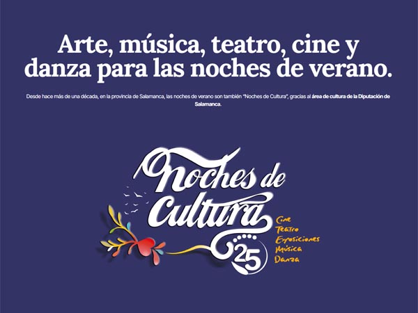 27.10.2025.- El programa “Noches de Cultura” ha cerrado su undécima edición con un balance muy positivo: 31.782 espectadores han participado en las actividades desarrolladas entre el 19 de julio y el 3 de septiembre, recorriendo 74 municipios de la provincia de Salamanca. Esta iniciativa del Área de Cultura de la Diputación continúa consolidándose como uno de los proyectos más esperados del verano, acercando la música, el teatro, la danza, el cine y las artes plásticas a los pueblos salmantinos.