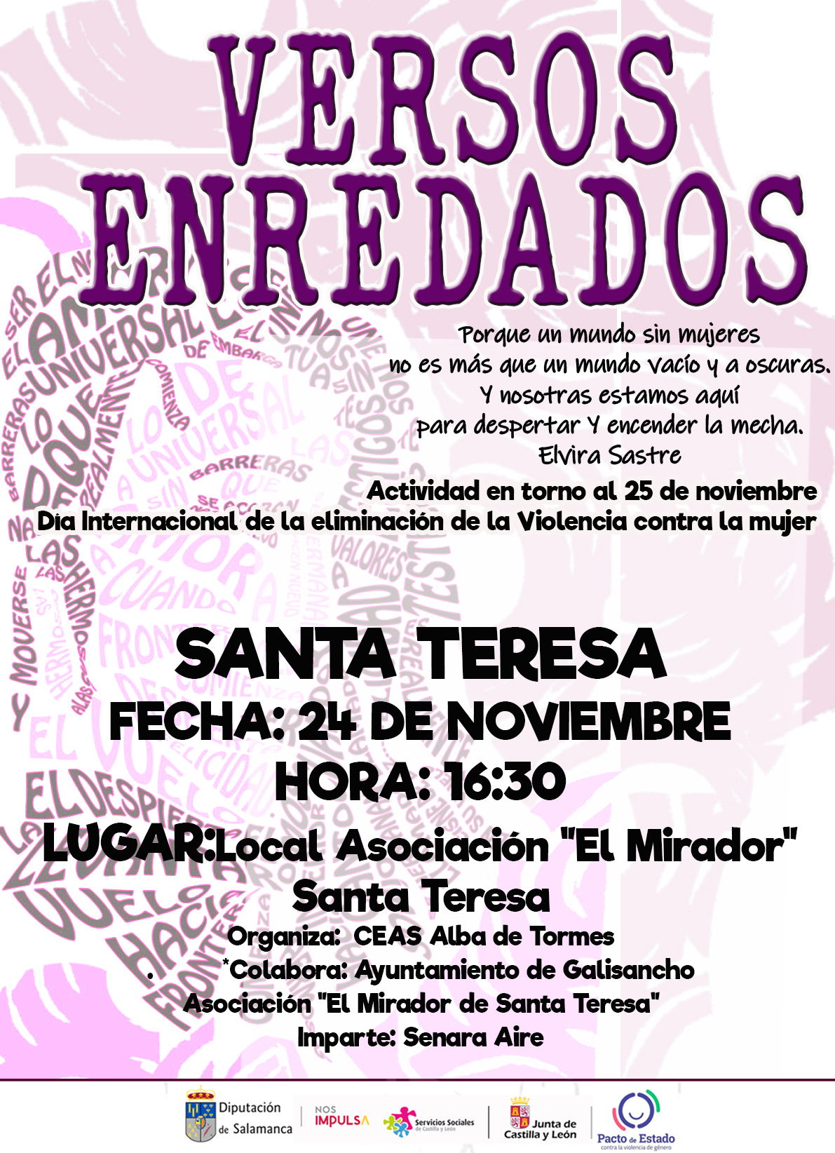 Taller con motivo de la conmemoración del 25 de noviembre, día internacional para la eliminación de la violencia de género, con el objetivo de fomentar la igualdad y prevenir la violencia de género. En el taller se realizará entre otras acciones, una poesía cooperativa. Dirigida a la población en general, desarrolla Senara Aire. Lugar: sede de la Asociación de Mayores.